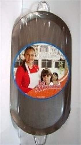 Oval Skillet - Comal 17" x 8 1/2" The comal is a cooking utensil that no authentic Mexican kitchen can be without! La Mexicana brings you their quality large comal, which is an oval, griddle metal plate, shallow cooking pan. Also known as skillet this cooking tool is used mainly to bake or warm up tortillas, quesadillas and even to blister chiles for use in salsas or dishes with stuffed or sliced chiles. Note that most comales require cleaning and seasoning prior to use since they are uncoated, this method will prevent your griddle from being sticky to foods and rust-prone. Learn all you need to know about Tortillas and prepare deliciously authentic Flour Tortillas with MexGrocers Mexican recipes. Features: Metal Plate griddle. Wash with water and soap. Cloth dry immediately after washing and do not store away when wet. 44 cms / 17.3 Made in Mexico