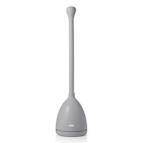 The OXO Good Grips Toilet Plunger and Canister is designed to open when you lift the Plunger and close when you replace it for neat and hassle-free plunging. The flat-top handle provides a secure, comfortable grip while you work. The Plunger head works on all toilets, including low-flush models. The ventilated drip tray contains any excess water and allows it to evaporate. The tidy Canister keeps the Plunger out of sight when not in use.
