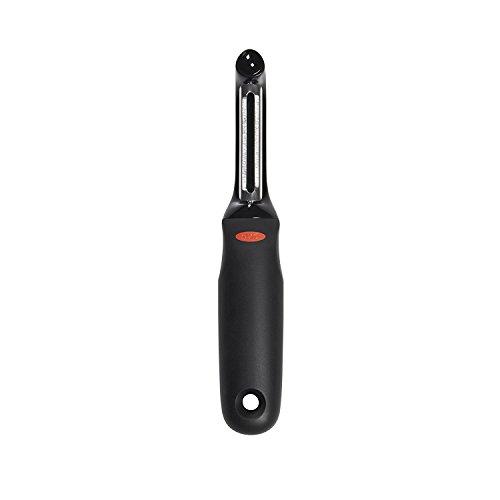 OXO Soft Works Swivel Peeler Hold the Soft Works peeler and you can feel the difference. The perfectly contoured, soft handle fits gently into any size hand. The enlarged handle means added strength and less stress for all kitchen tasks. The soft Santoprene handle is safer it won't slip even when wet. Stainless steel blade.
