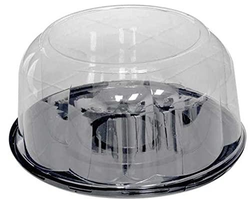The Pactiv RPET Black Cake Base with Rose Dome Lid is a great choice for storing or carrying a 9-inch cake. It consists of a 5.25-inch crystal clear RPET RoseDome lid and a 11-inch black cake base. This cake container resists cracking. Suitable for bakeries, cake shops, and cafes, this bulk case contains 40 Pactiv cake containers.