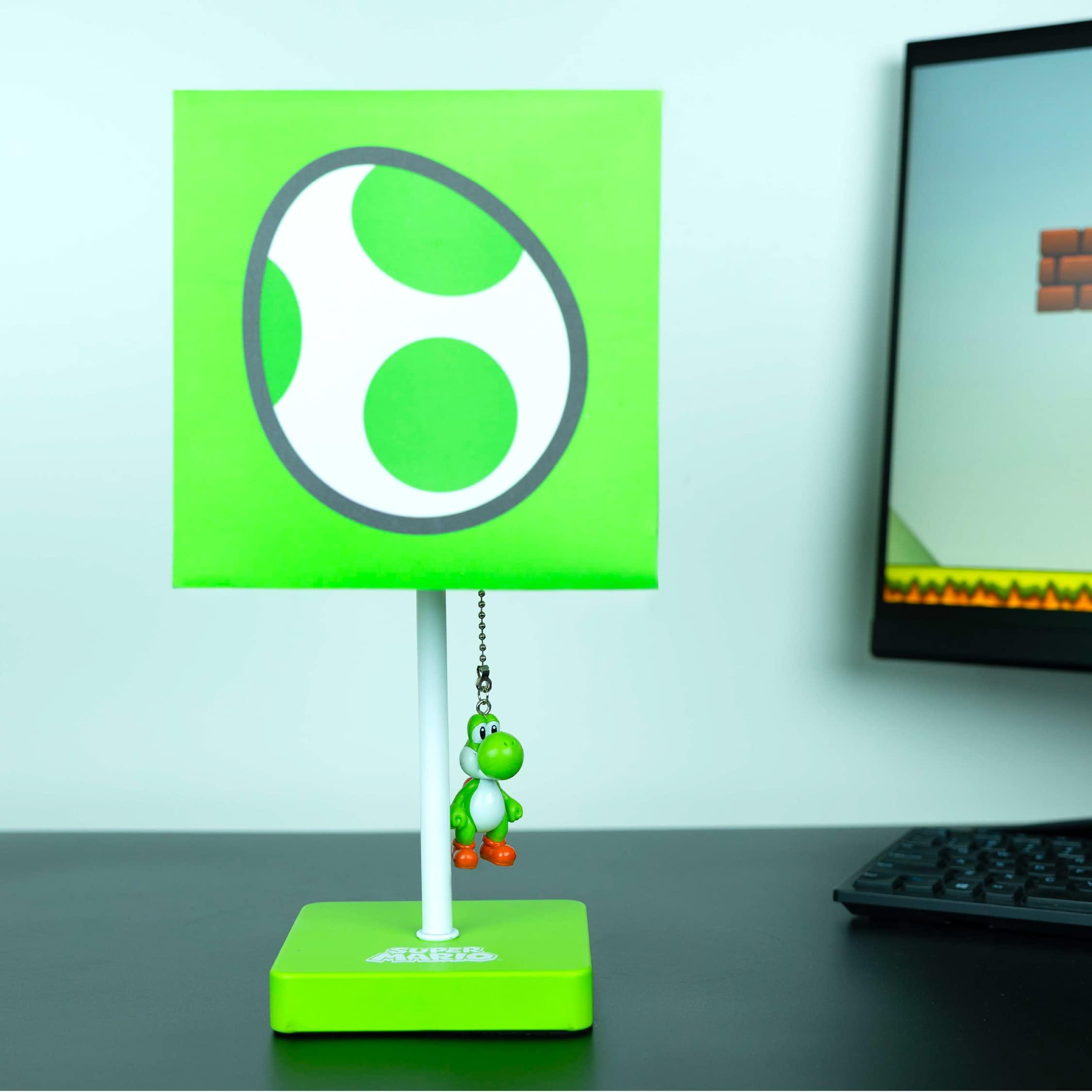 - VIDEO GAME TABLE LAMP: Perfect Nintendo item as the finishing touch in a gaming room. This green lamp is powered by the included standard plug & is switched on & off with the Yoshi character figurine.