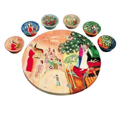 Arbel Judaica online store is proud to present Yair Emanuel unique collection of Seder Plates with Six Small Bowls.This elegant seder plate is a wonderful way to bring more color to your Pesach table.The plate itself is made of a round piece of hand painted wood depicting the breathtaking Crossing of the Red Sea.The plate comes with six small bowls to hold the different ingredients for the seder, and they too are feature scenes from the exodus from Egypt.This is your perfect gift for Passover, weddings and the new home. Size: 12.6" X 2"