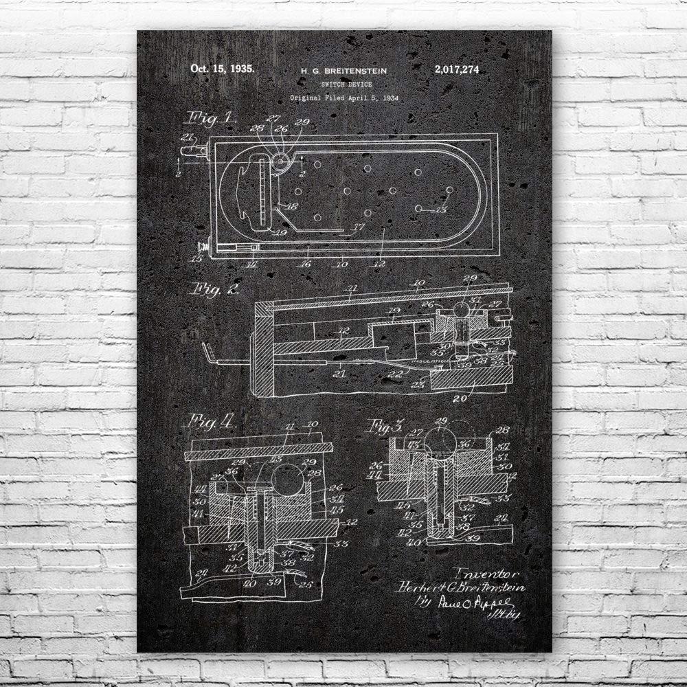 - 24" x 36" poster print featuring a Pinball Tilt Mechanism patent illustration on a Dark Concrete style background. Designed by Patent Earth, this wall art is made to order and customized with your choice of size and background!