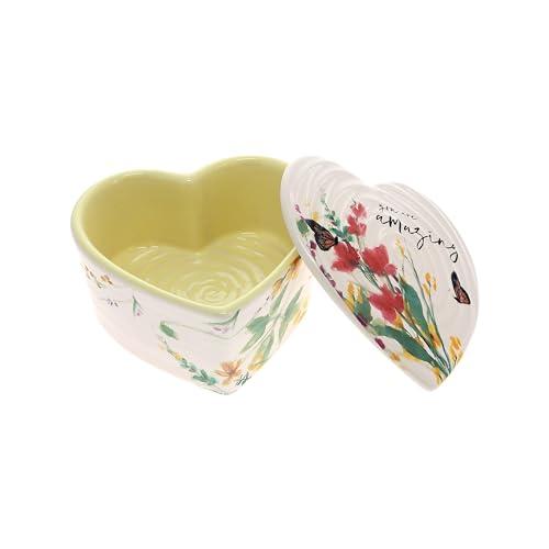 Meadows of Joy is a collection of houseware and home decor items by Amylee Weeks that was created to bring beautiful flowers and colors found in meadows into your home! The line is saturated with soft artwork that truly captures nature at its best. This beautiful ceramic heart-shaped keepsake box is the perfect way to store your most precious memories. Its intricate design features a creamy matte glaze and delicate pink and yellow accents, creating a unique and eye-catching piece. The lid lifts off easily, allowing you to store jewelry, photos, and other keepsakes inside. It features a watercolor floral design, a butterfly, and the easy-to-read You Are Amazing sentiment. The interior of this heart-shaped box features a coordinating pale yellow color. With its timeless design and charming details, this keepsake box is sure to become a treasured part of your home.