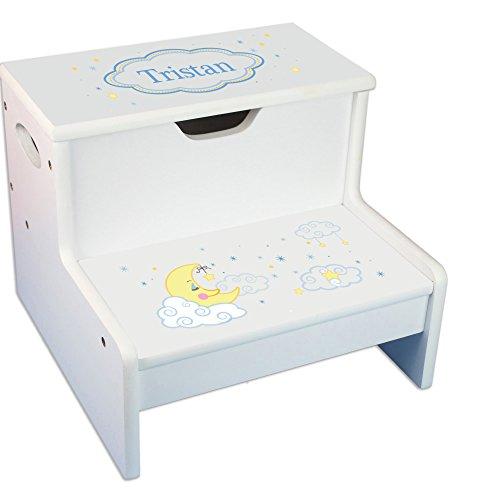 Our MyBambino Personalized White Step Stool and Storage with Moon and Stars Design is a fantastic stool for the kitchen, bath, or bedroom. Sturdily contructed this stool is designed to last. Comes with handy storage compartment to boot. Measures 9 3/4"h x 11 3/4" x 11 3/4"d. Bottom step is 4 1/2" off the ground. Adult assembly required.