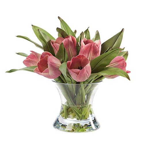 "Just Picked from the Garden" Appeal Nine luscious tulips, realistic even to the touch, cluster with their lush leaves in a classic nosegay design. Our clear acrylic water completes the illusion of fresh garden tulips in a 5-1/2" shapely glass vase. This mass gathering of springtime favorites will bloom all year long. Available in four garden fresh colors.