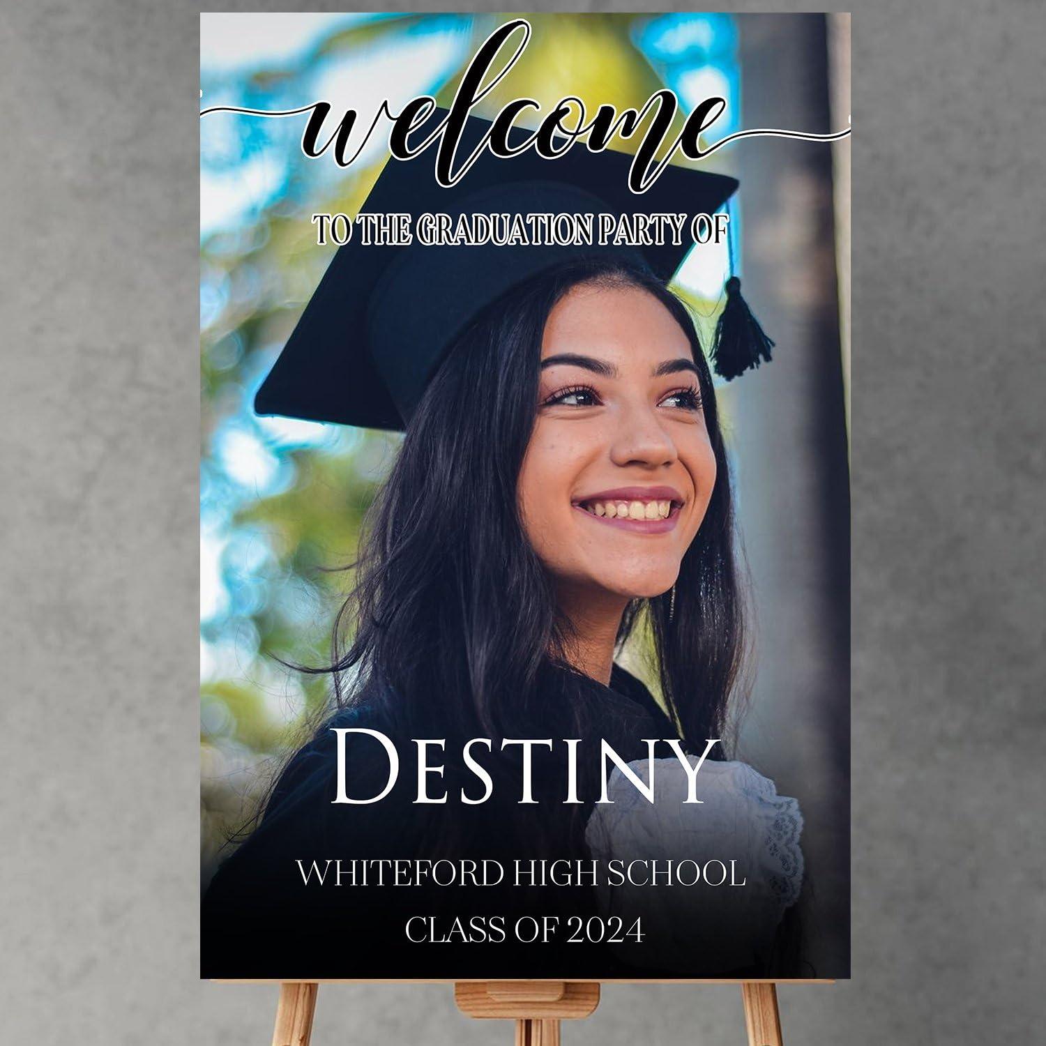 - Make your graduation party unforgettable with our personalized graduation welcome sign. Our custom design allows you to showcase your graduate's achievements and create a unique party decor. Perfect for indoor or outdoor use, this high-quality sign is a great addition to any celebration. Welcome your guests in style and make your graduate feel extra special on their big day. Elevate your graduation party decoration game!