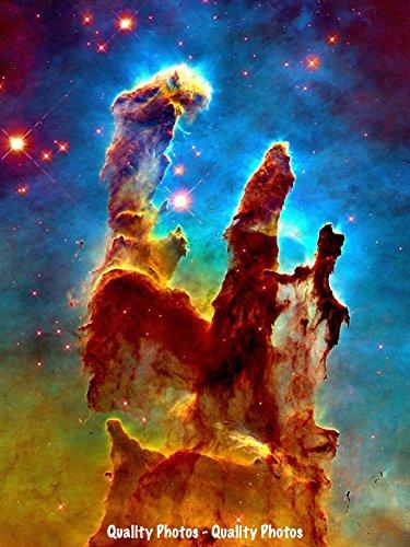This photo print shows three giant columns of cold gas bathed in scorching ultraviolet light from a cluster of young, massive stars in a small region of the Eagle Nebula, also known as M16.