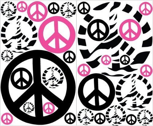 32 total Individually cut out peel and stick Pink and Black, Zebra Print Peace Sign wall decals set on two 9.5in by 15in panels. The 2 largest Peace Sign Wall Stickers Measure about 9.25in in diameter. 4- Peace Wall Decals that measure about 4.25in in diameter. 6- Peace Sign Wall Decals measure about 2.25in in diameter. 4- Peace Sign that measure about 1.50in in diameter. 16- Peace Sign that measure about 2 to 1in in diameter. These wall decals are easy to use just peel and stick them to just about any smooth surface. They are also very easy to remove and repositions if needed. These Zebra Wall Decals will stick to walls, wood, plastic and can even be used as School Locker Decals, as they are cleanly removable. They are sure to compliment any Peace Sign Wall Dcor or Teen Room Dcor.