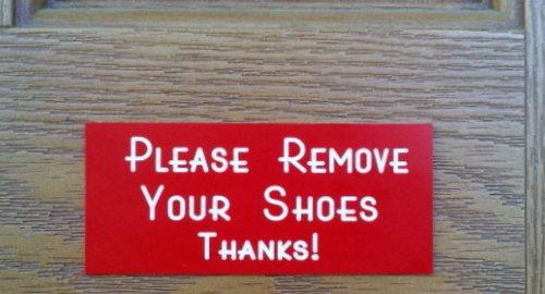 We make these Please Remove Your Shoes signs on plastic that we engrave. The size is 2" by 4 1/2". We put double sided tape on the back for you to hang it with. This one is red with white lettering. We can make them in different colors if you ask for it. Make sure you email us right after you buy it because sometimes we will ship it right away if it is timed right. To see more of our products click on "All About Signs 2" above.