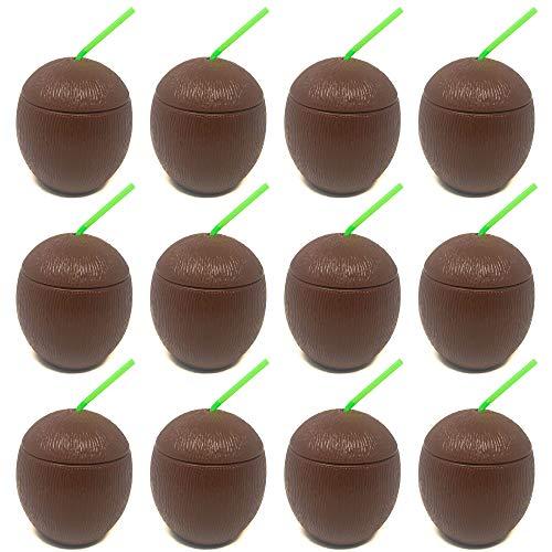 Podzly Podzly - 12 Piece Tropical Luau Theme Coconut Cups - 12 Oz Hawaiian Plastic Mugs with Straw and Removable Lid - Set for Drinking Cups or Party Favors - Perfect for Beach, Pool, and Tiki Parties