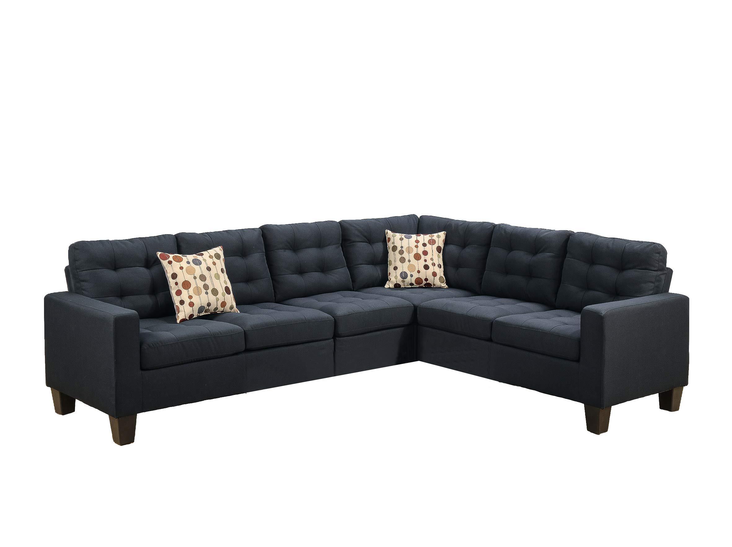 Fusing the contemporary and classic design with this collection of 4-piece modular sectionals covered in soft linen. With plush seating and back support, each piece is accented with asymmetrical tufting and stitching to enhance your living space. Compliment the sectional with accent pillows. Available in black and navy . Dimensions : LAF one-arm loveseat 52" x 32" x 35" H corner wedge 32" x 32" x 35" H RAF one-arm loveseat 52" x 32" x 35" H Armless chair 23" x 32" x 35" H