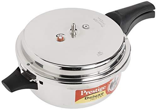 The Prestige Pressure Pan is designed to give you more body capacity as compared to normal outer lid pressure cooker. Comes with a first time 2-in-1 safety device called PI (Pressure Indicator) . The device will rise while there is pressure inside the cooker and will come down when there is no pressure thus indicating that it is now safe to open the vessel. It also fuses at high pressure thereby serving the dual purpose of a Metallic Safety Plug. Uses best quality Stainless Steel with stronger lugs and thick base to give your cooker a safe and long life.