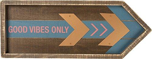 A slatted wooden inset box sign in an arrow silhouette featuring metal chevron additions, color blocked accents, and "Good Vibes Only" sentiment. Complements well with coordinating design pieces or existing dcor. Easy to hang or can free-stand alone.Details:Materials: Metal, WoodSize: Optimistic and chic.
