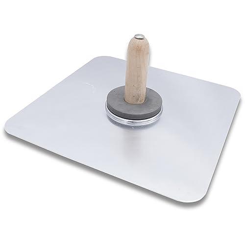 Made of heavy gauge aluminum. Light but durable. The edges have been smoothed and the corners rounded for greater comfort. 3 5/8" flange with extended bushing that is threaded for the handle. Wood and foam handle, prevents calluses included.