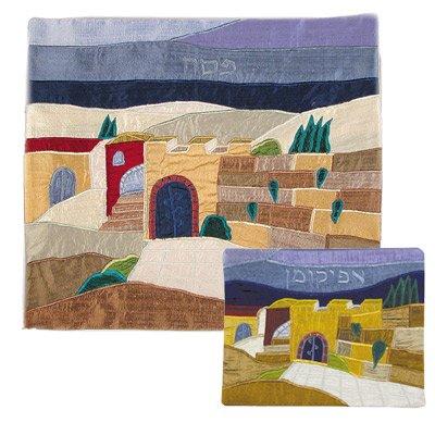 Raw Silk Appliqued Matzah Cover and Afikoman Cover Jerusalem By Yair Emanuel