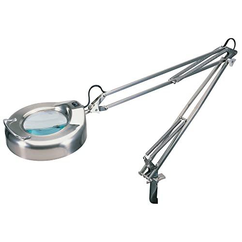Spot anomalies while assembling your designs with this Realspace magnifier task lamp. The 22W full-spectrum Circline fluorescent bulb illuminates items with a glare-free natural daylight effect, while the three-diopter glass lens offers a closer look. This Realspace magnifier task lamp features a fully adjustable arm and shade to provide multiple lighting positions, and the heavy-duty metal clamp offers simple mounting on different surfaces Clamp-style base supports versatile placement. Metal shade construction provides longevity. 22W bulb offers high-performance for effective lighting. Brushed nickel finish delivers a blending look with rooms design. Backed by manufacturers 1-year limited warranty.