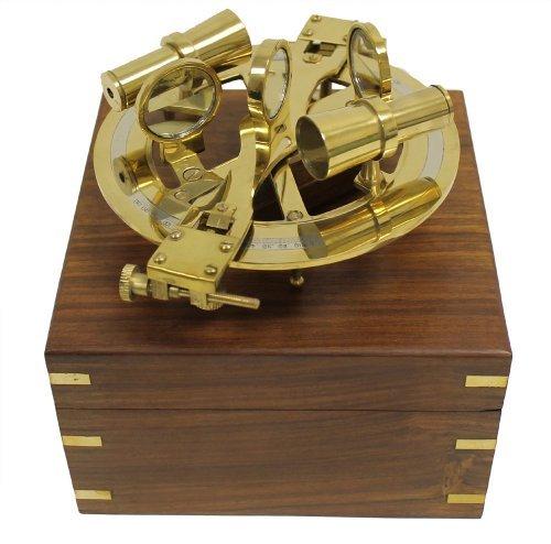 This nautical display, round sextant is made of brass. The sextant is about 8" wide and 3" tall. The sextant comes with its own nautical wood box. The box is about 8.5" wide and 4" tall. The sextant includes a moveable radial arm, telescope, mirror, colored light filters, and handle. This is a new item, made to look like an antique. Some imperfections are likely. This sextant is meant to be a display piece.
