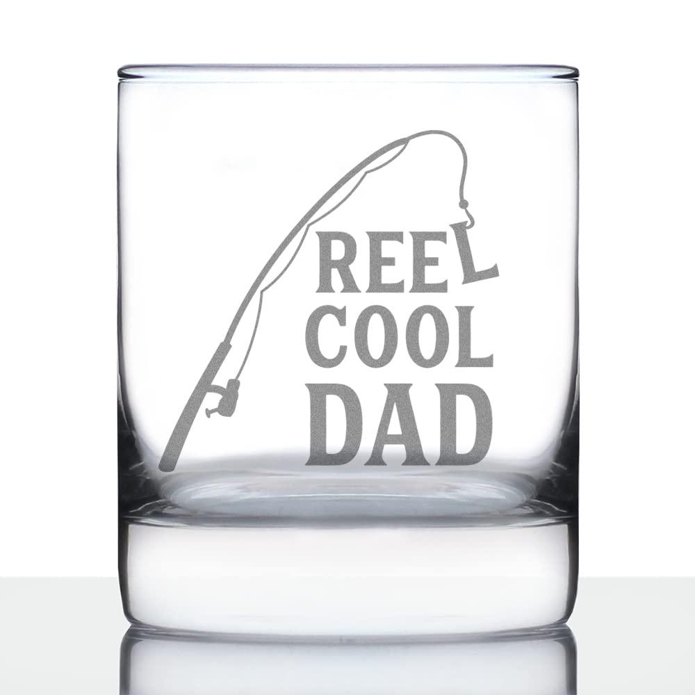 Reel Cool Dad - Funny Whiskey Rocks Glass - Fishing Gifts for Fathers - Engraved 10.25 oz Glasses - Fun Fish Cups