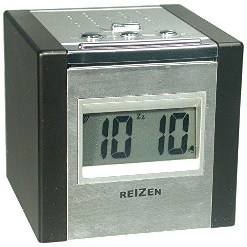 Reizen Talking LCD Alarm Cube Clock - Silver and Black - Reizen Cube LCD Talking Alarm Clock with silver body and black panel has a soft green back-light display for those with low vision. This talking alarm clock features 3 alarm sounds: Rooster, steady beeps, cuckoo hourly announcement. Large snooze/light/talk button. High low volume time announcement. Top speaker. Requires 2 AA batteries (not included). Time display is 3/4 inch high.