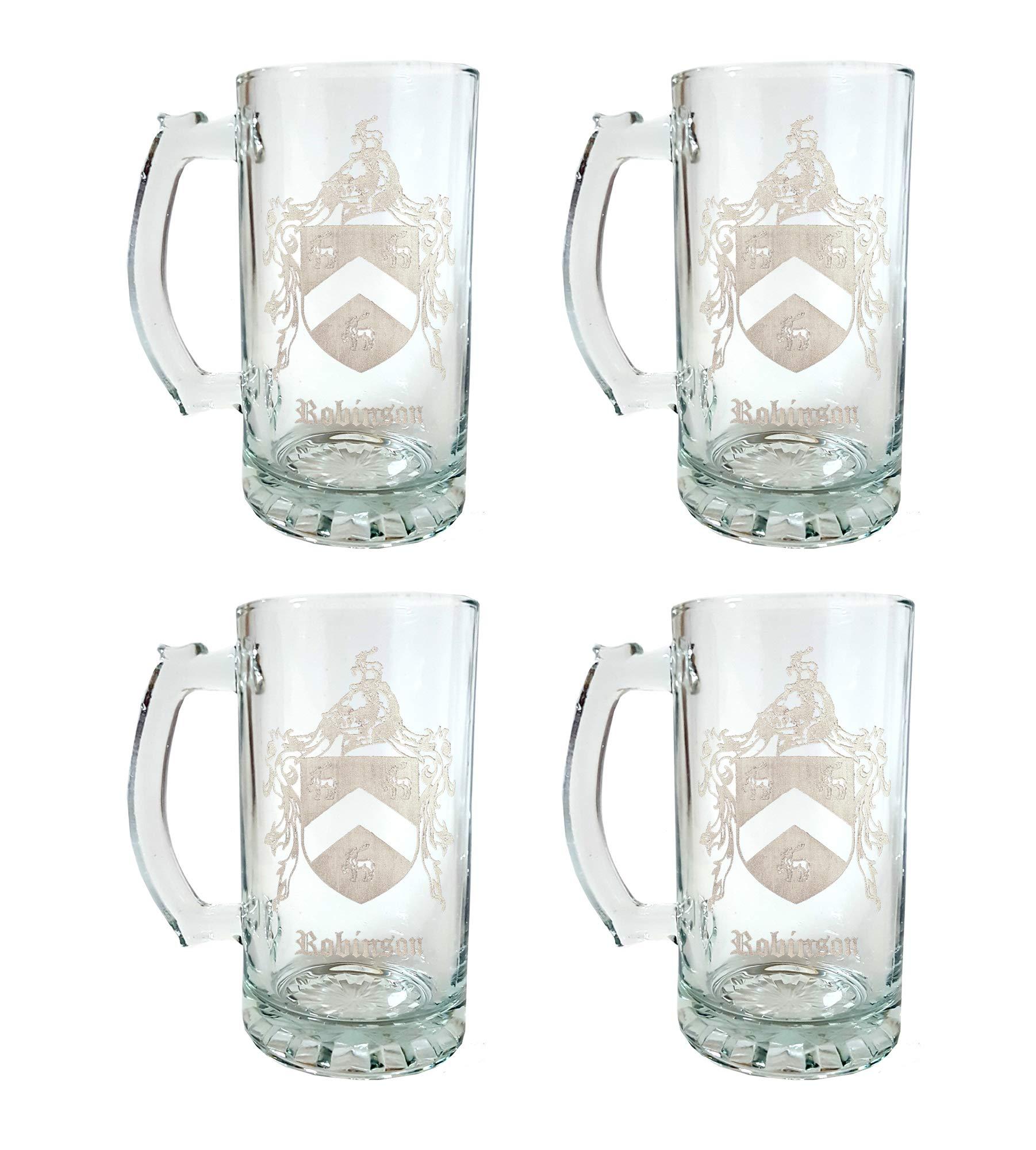 Robinson English Family Coat of Arms 27oz Beer Stein Set of 4: Free Shipping & Personalized Engraving Each glass is engraved with the Robinson Coat of Arms and the name "Robinson " Below in Old English Font. The English name Robinson literally means "son of robin" robin often means bright or fame. Today Robinson is one of the most prevalent names in Australia, the United Kingdom and the United States. *The engraving will not fade and the glass is dishwasher friendly. *We can design any family coat of arms, please contact us for your custom glasses! *Ask us about sets and large quantity discounts! (orders of 25 + units) FREE PERSONALIZED ENGRAVING: We offer free personalized lettering on ALL of our glassware! There is no limit on lettering but we ask that you please consider what will fit with the design. If you would like to personalize your order, just send a message with your purchase and please state the following: 1.) What you would like engraved with spelling, punctuation and capitalization as you would like them. 2.) Where you would like the glass engraved; 1.Above the design, 2.Below the design, or 3.Opposite the design. 3.) Font selection; Old English, Celtic or Elegant (please refer to picture above in listing for examples) Dimensions : Height : 8 " Width : 3 " Volume : 27 oz. *Free Shipping *Free Personalized Engraving *We will replace any glass damaged during shipping promptly and free of charge