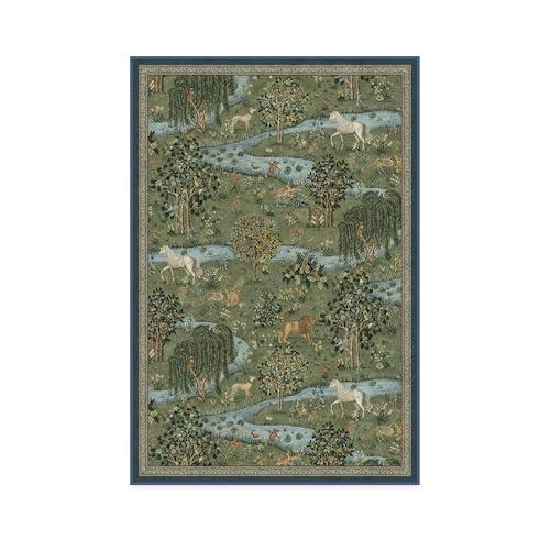 - INTRICATELY DECORATIVE, SIMPLY WASHABLE: This whimsical, tapestry-like landscape features charming animals and a meandering river amidst a stylized forest with pops of yellow, blue, orange, coral and red on a lush green background