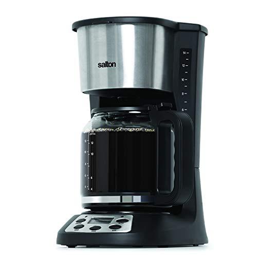 Wake up to freshly brewed coffee with the Salton Jumbo Java Coffee Maker. This 14-cup coffee maker has a 24 hour programmable timer. It includes a keep-warm plate that maintains the ideal drinking temperature. The attractive stainless steel accents are perfect for any kitchen.