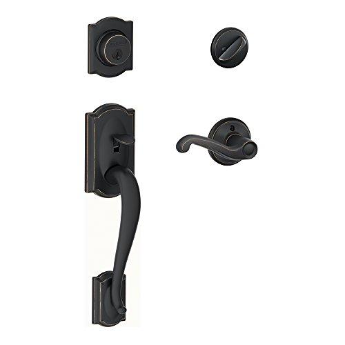 The Camelot Single Cylinder Handleset and Right Hand Flair Lever in Aged Bronze is perfect for use on exterior front doors. The elegant Flair levers ornate details are reminiscent of a paper scroll, while the Camelot trims scalloped architectural details make any room charming and approachable. Our Aged Bronze finish is inspired by traditional design, featuring warm, copper tones that break through its darker, aged exterior. Plus, its been designed and tested with strength and durability in mind.