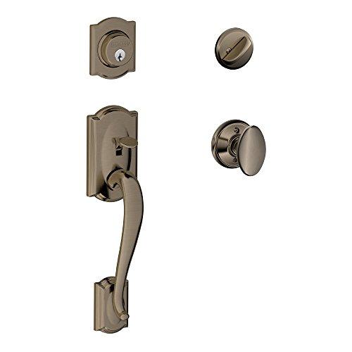 The Camelot Single Cylinder Handleset and Siena Knob in Antique Pewter is perfect for use on exterior front doors. The Siena knobs eye-catching oval shape gives it a unique and memorable look, while the Camelot trims scalloped architectural details make any room charming and approachable. Our rich Antique Pewter finish adds an extra touch of sophistication. Plus, its been designed and tested with strength and durability in mind.