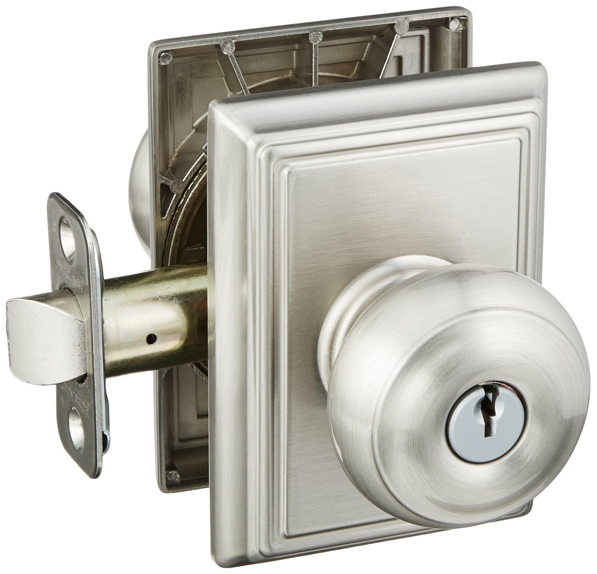 F51AGEO619ADD Satin Nickel F Series Georgian w Addison Rose Entry (Keyed) Function - Locked by Key & Rotating Cylinder from Outside; Unlocked by Key on Outside or when opened from inside ANSI A156.2 Grade 2 Square, Round, or Drive-In Latch 2 3/8" or 2 3/4" Backset Round & Square Corner Full Lip Strikes 1 3/8" - 1 3/4. Cross bore