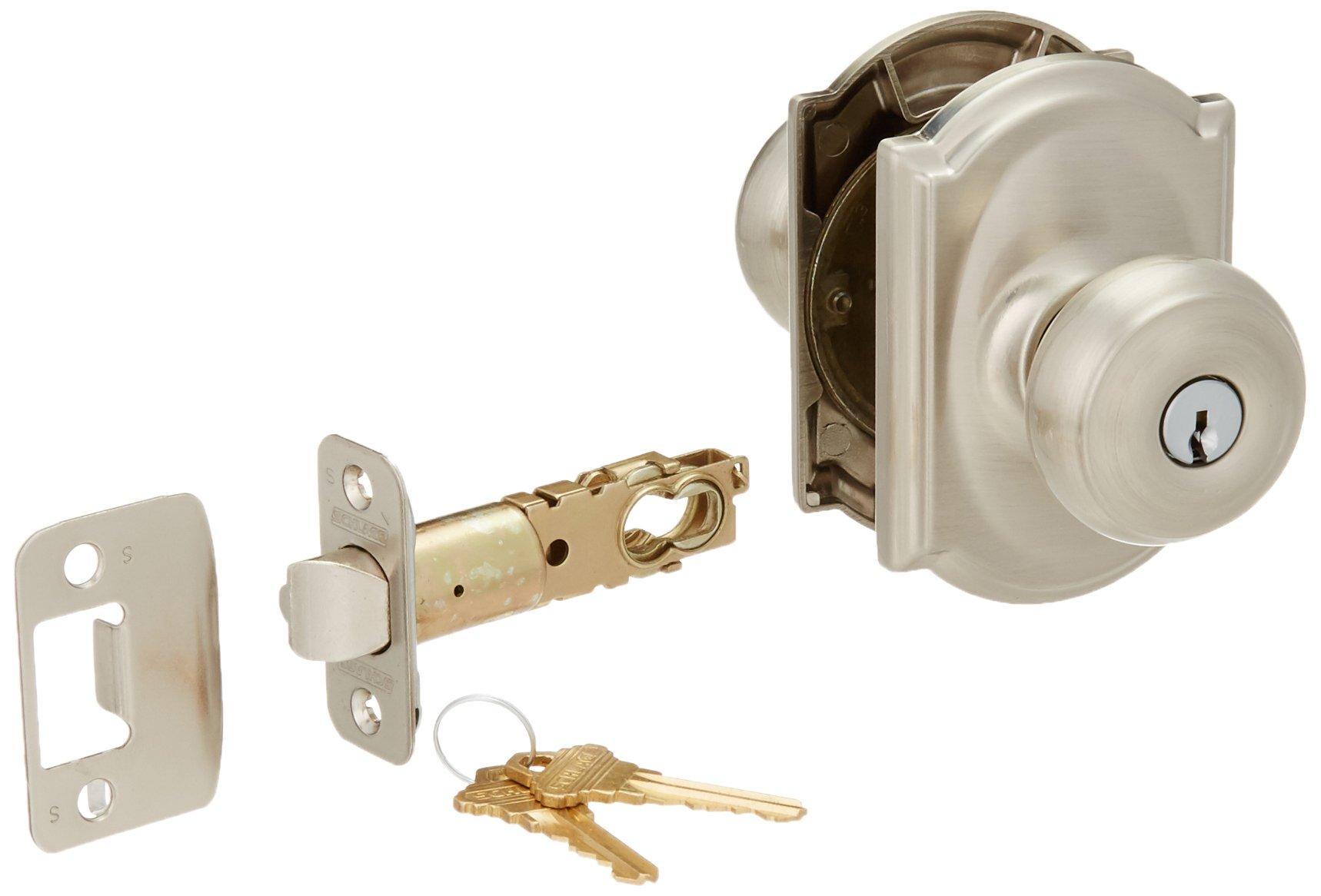 F51AGEO619CAM Satin Nickel F Series Georgian w Camelot Rose Entry (Keyed) Function - Locked by Key & Rotating Cylinder from Outside; Unlocked by Key on Outside or when opened from inside ANSI A156.2 Grade 2 Square, Round, or Drive-In Latch 2 3/8" or 2 3/4" Backset Round Corner Full Lip Strike 1 3/8" - 1 3/4. Crossbore