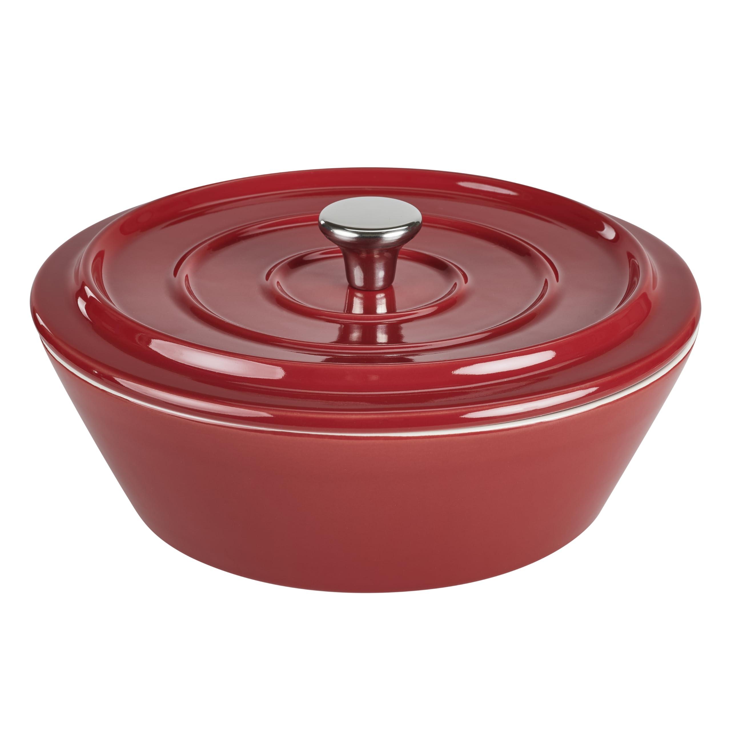 Elevate your baking endeavors with this stoneware baking dish, designed to take casseroles and cobblers to new heights. Crafted for superior heat distribution and retention, the stoneware ensures that your culinary creations bake to a perfect golden finish with even consistency. Resilient against scratches and stains, this baking dish guarantees enduring beauty and functionality, making it a cherished addition to your kitchen arsenal for years to come. The set includes an oval pan and a matching lid, both adorned in a vibrant red hue. With dimensions measuring 9" x 9" x 3.5", this baking dish is not only a practical tool for your culinary adventures but also a stylish accent that seamlessly transitions from oven to table. Transform your baking experience with this stoneware masterpiece that marries form and function in every delicious creation.