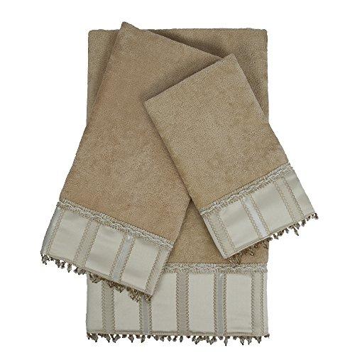 - Set includes: One (1) embellished bath towel, one (1) embellished hand towel, one (1) embellished fingertip towel