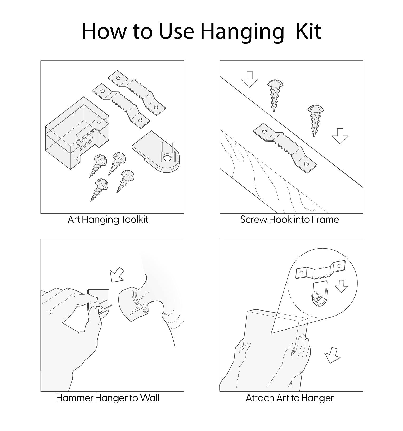 Our artwork comes with different sizing options. Measure your wall, then pick the appropriate size. Hanging is made simple with our complimentary hanging accessory toolkit.