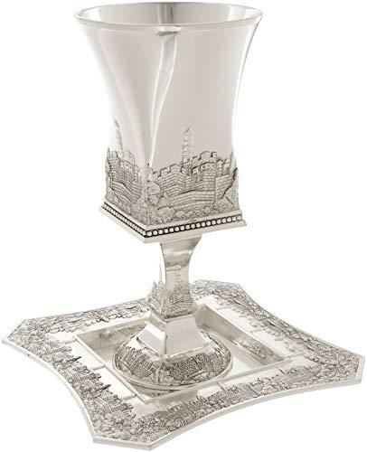 - Silver plated Square Jerusalem Design Kiddush Wine Cup and Tray For Shabbat and Holidays