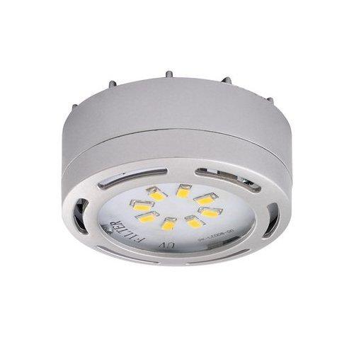 LED-PL1WHT, LED-PL1BLK, LED-PL1NKL Single 120V LED Puck Light Accent Kit Surface or Recess mount Warm White, 4 Watt each puck 50% brighter than halogen or xenon puck 6 ft wire with on/off switch Color: White, Black, Nickel