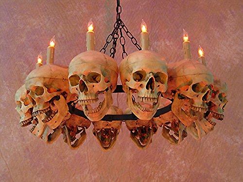 Life-size Skull chandelier made with twelve skulls in a circular pattern, all looking slightly down with jaws open in horror. The skulls form a circle that measures 30 in diameter and is 14 tall from bottom of jaw to tip of candle. The lights easily plugged in to any wall outlet. This chandelier would be great for any Halloween, horror, or gothic event. It definitely helps set an eerie atmosphere. The hanging weight is about 36 pounds The twelve 3-watt flicker bulbs are included!
