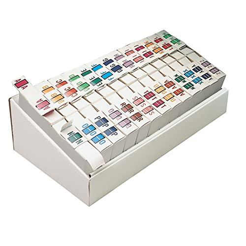 Use alphabetic labels to put an end to misfiled records and speed file retrieval time. Keep files organized at a glance with alphabetic labels that feature a wraparound solid color bar and a colored letter printed on a white background. Colors are compatible with end tab systems using the bar-style format. Clear laminate keeps labels clean and colors bright, even with frequent handling. Desk model assortment rolls. 1 roll of each letters A-Z. 26 rolls with 500 labels per roll in a corrugated display. Total of 13,000 labels. Label size: 1-1/4" W x 1" H, before folding. Made in the USA. Compatible with TAB Products labels 1283 Series. Self-adhesive products have a limited shelf life. Store in a cool, dry place. Press firmly when applying.