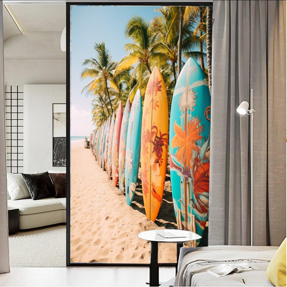 SOPIYRIO SOPIYRIO Beach Surfboards Stained Glass Window Film Tropical Palm Trees Summer View Privacy Window Film Non-Adhesive Glass Film Decorative Static Cling Film for Home Office 31.5Wx47.2L inch