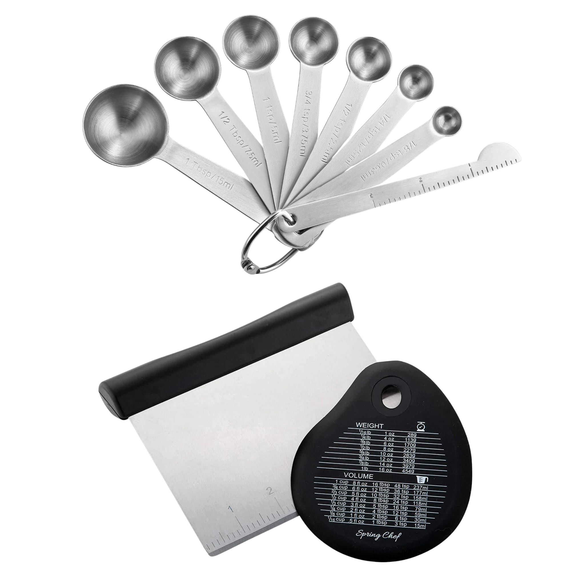 Spring Chef Round Stainless Steel Measuring Spoons, Set of 8 & Bench Scraper With Bonus Bowl Scraper, Black - 2 Product Bundle