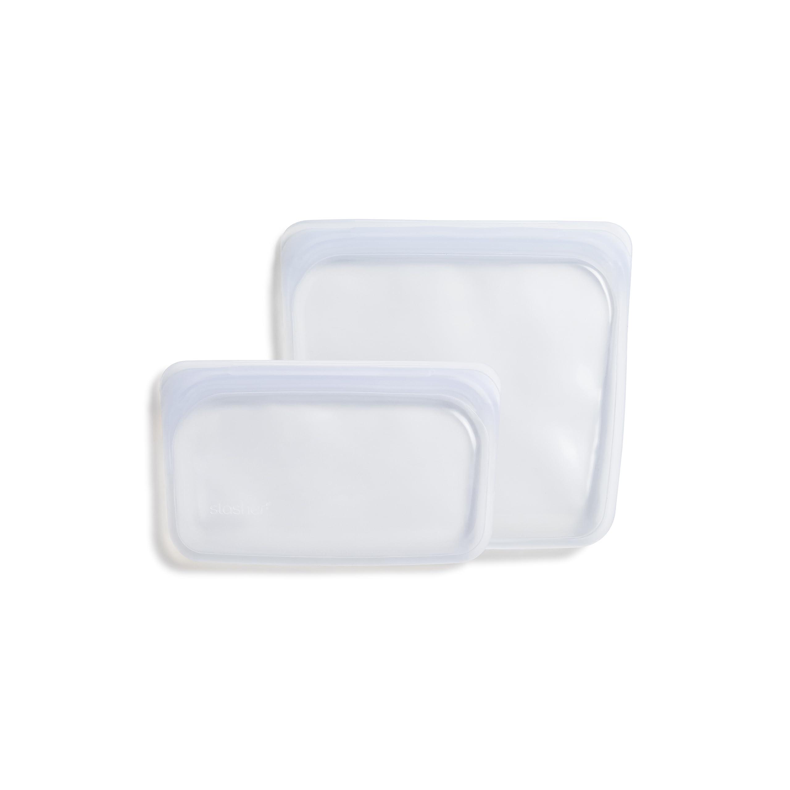 - CONTAINS: 2 Stasher Reusable Silicone Bags in the color Clear. Includes 1 Sandwich (28 Fl Oz), and 1 Snack (12 Fl Oz) Bag.