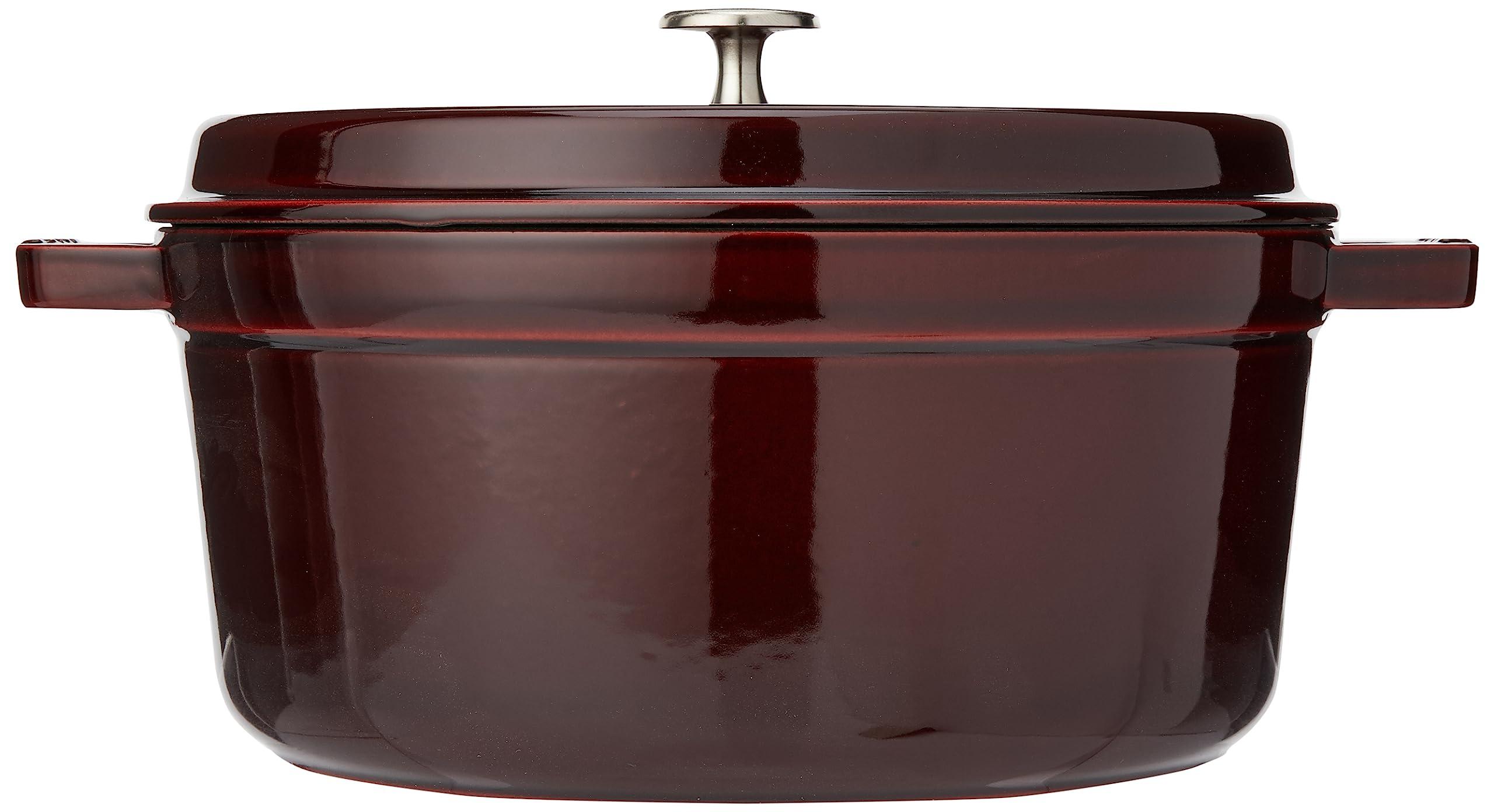 Round roaster made of enamelled cast iron with a 5 litre volume, Ideal for browning, slow cooking and stylish serving of meat, fish, fruit or vegetables - Energy-saving cooking in the oven and on all types of cookers including induction, Juicy and tender result due to special drop structure in the lid, Long-lasting temperature storage for cold and hot food - Practical and tasteful design: Handy, ergonomic handles, Metal lid knob heat-resistant up to 250C, Vivid colours, Highlighted lettering - Made in France: Uniquely handmade, Scratch-resistant and durable thanks to interior enamel, Acid-resistant, Taste neutral, Easy hand wash, Dishwasher safe - Contents: 1x STAUB roaster, Dimensions with lid + handles (LxH): 32.7 x 16.7 cm, Diameter: 26 cm, Base diameter: 21.7 cm, Volume: 5 L, Weight: 5.7 kg, Colour: Grenadine, 40509-359-0