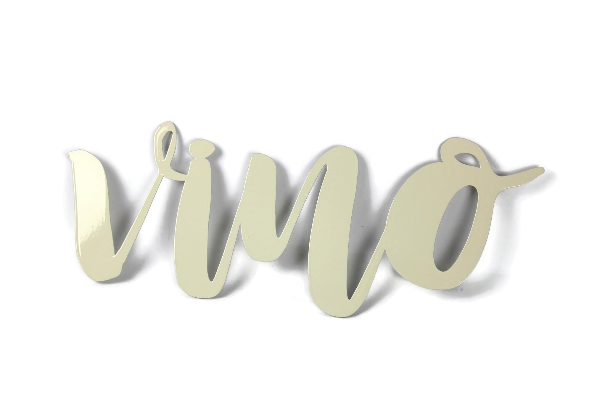 vino steel script sign. This beautiful metal sign is available in your choice of sizes and finishes. Standard size word is 7.25x18" in size. This word art is cut from steel about as thick as a nickel. All color choices are covered in a durable powder coated finish. These options are ready to install and safe to display indoors or out! Signs can be hung with commercial grade double-sided tape, removable adhesive strips, or you can use small finish nails through the openings in letters. We hope to provide you with a great starter piece for a fun project! All of our products are Made in United States of America and made to last!