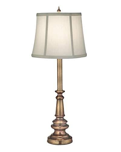 This slender antique brass finish metal table lamp has a simple yet elegant contoured base. Topped by a soft ivory shadow fabric shade, it will enhance most any traditional or transitional style room decor. This beautiful Stiffel lamp is made in the U.S.A.