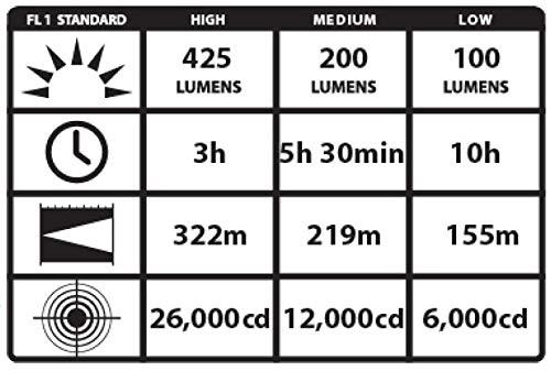 - 425 lumens and 322 meter beam on high mode