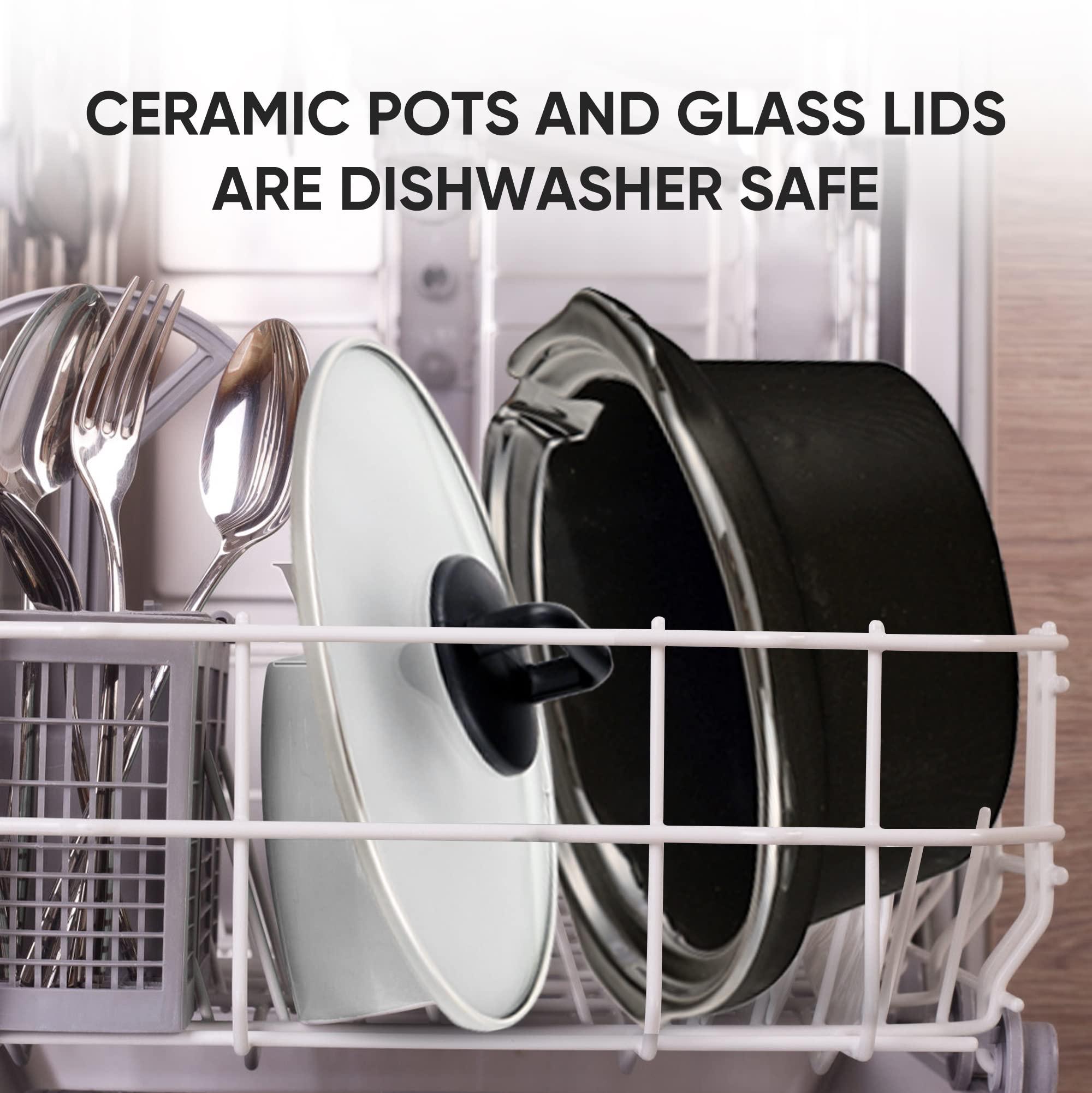- GLASS LID FOR EASY VIEWINGEach slow cooker is accompanied by a glass lid with a convenient glass handle, allowing for easy viewing of the cooking process. Note: Avoid touching crocks with hands after cooking.
