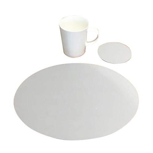 Shatterproof acrylic placemats and coasters, with anti-slip silicon feet (see photo). Heat resistant up to 80 degrees. Wipe clean with a damp micro cloth (Do not use abrasives or knives).