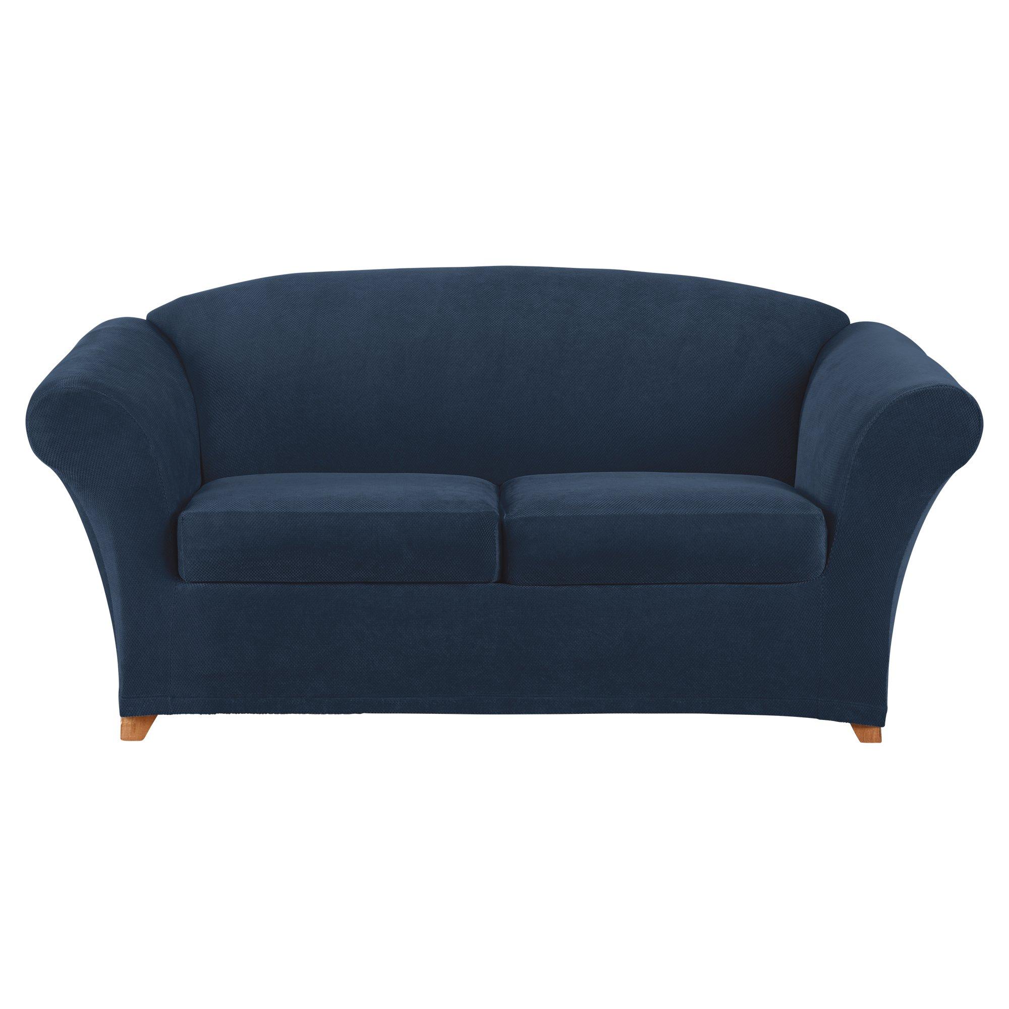 Elevate your home decor with the SureFit Stretch Pique Three Piece Loveseat Slipcover, a perfect blend of style and functionality. This loveseat and separate cushion covers are designed to effortlessly transform your living room, adding a touch of style and protection to your favorite loveseat. Crafted with precision to fit most loveseats measuring 58" to 73" across the outside arm to arm, this loveseat and cushion cover set showcases a subtle geometric design. The slightly raised waffle-knit pattern exudes a cozy, inviting feel. The soft two-way stretch fabric, made from 94% polyester and 6% spandex, ensures a snug fit. The form-fit stretch design includes a slipcover with two zippered separate seat cushions, allowing for easy installation and maintenance. Elastic at the bottom perimeter holds the loveseat cover securely in place, ensuring a tidy appearance. Plus, it's machine washable, making cleanup a breeze. Not only does this loveseat slipcover enhance your living room decor but it also serves as a reliable furniture protector. Designed for use with furniture that has removable seat cushions, it guards against spills, stains, and everyday wear and tear, extending the lifespan of your loveseat. Available in our largest collection of colors.