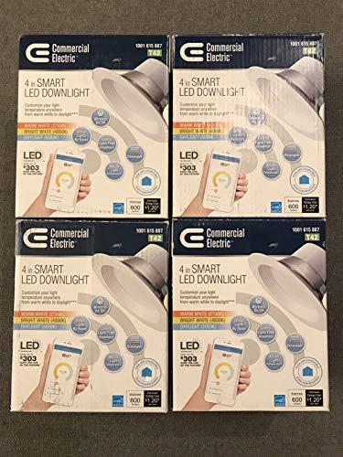 4-Pack: This 4 in. Commercial Electric Smart LED Downlight is perfect for any application where high quality LED lighting is desired. It can be adjusted to suit your needs with light output from soft white (2700K) to Daylight (5000K) and anywhere in between. Control your lights from anywhere Control on/off, dimming, and adjust light temperature from your smart device 2700K to 5000K color tunable - warm white to bright white to daylight or anywhere in between 50,000 hours rated Specifications Dimensions Aperture width (in.) 3.9 Product Height (in.) 2.56 Housing depth (in.) 4.9 Product Width (in.) 4.92 Product Depth (in.) 4.92 Size 4 in. Details Actual Color Temperature (K) 2700 New Construction or Remodel New Construction and Remodel Adjustable Lamp Head No Number of Housings Included 0 Bulb Type Included Integrated LED Package Quantity 1 Color Rendering Index 80 Product Weight (lb.) .40 lb Color Temperature Warm White Reflector finish family White Fixture Finish Matte White Returnable 90-Day Fixture finish family White Watt Equivalence 65 Light Output (lumens) 600 Warranty / Certifications Certifications and Listings cUL Listed Manufacturer Warranty 5 Year Limited Warranty ENERGY STAR Certified Yes