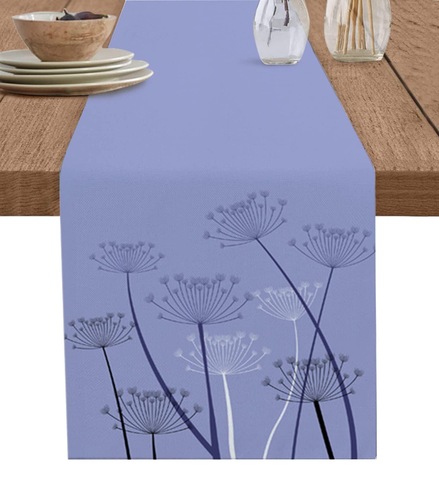 - AN EVERYDAY COLLECTION FOR YOUR KITCHEN - Our table runners are available in an assortment of colors and coordinate with our aprons,lunch mat,doormat,curtain,blanket,bedding set,shower curtain, and tablecloths - Own the whole collection - Purple and White Silhouette Dandelion Purple Background